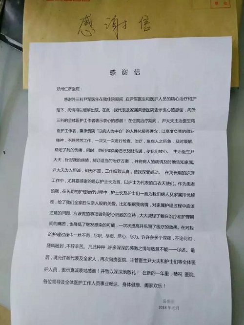 2月25-26日,郑州仁济医院的外三科不到24个小时,就收到了两封感谢信和一面锦旗。其中,一封感谢信和一面锦旗是送给外三科谷国俊副主任,另一封感谢信则是为了感谢外三科尹军医生的。长长的文字、走心的编写、详细的叙述,在新年之初就把我们暖透了……