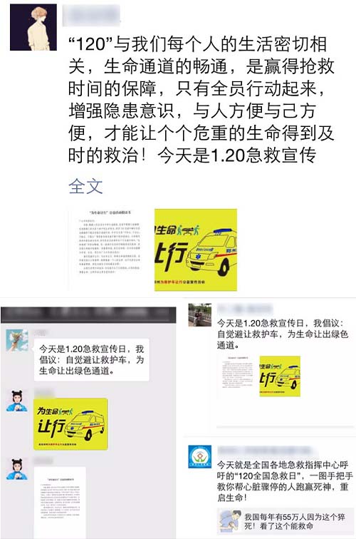 除了以上的宣教方式外,急救人员还在医院的微信群、朋友圈、微博等地方,转发“为生命让行”的倡议,从身边的医护人员做起,再带领医护人员身边的人,进而带动、覆盖更多的人群。