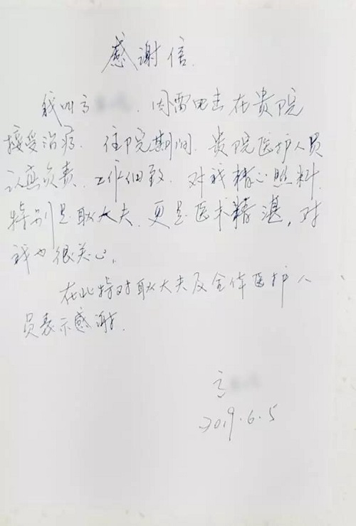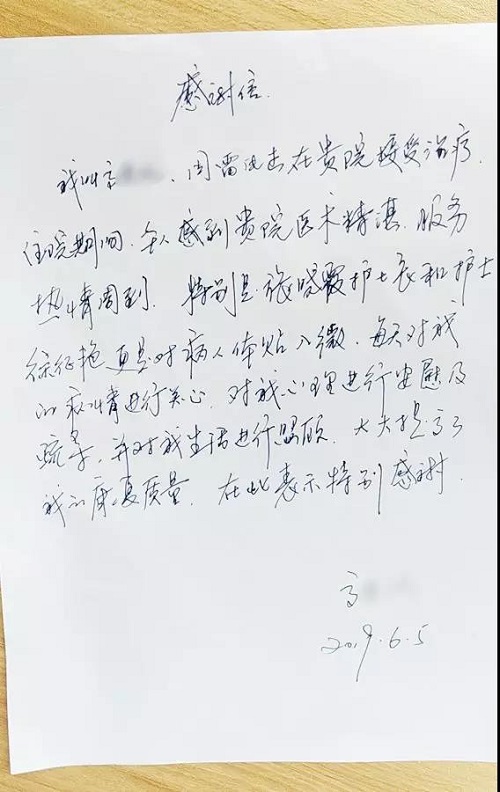 为了感谢住院期间耿一心副主任、张晓霞护士长及科室人员给予的精心照顾,特意手写了两封感谢信送给她们,以此表达心中无限的感谢。