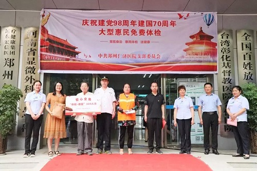 7月12日,郑州仁济医院“庆祝建党98周年 建国70周年”的系列爱心活动,聚焦“困难党员、环卫工人及巡防队员”,为其进行免费体检,并举行了启动仪式。
