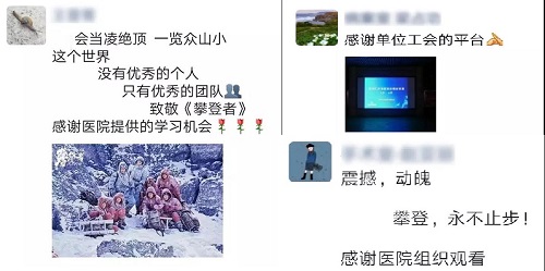 观影结束后,职工们纷纷表示,“致敬登山英雄!在登山队员的身上,我们看到了‘攀登精神’。而这种精神,对于我们来说任何时候都需要。因为我们的工作、生活、学习以及整个人生,都是一次次攀登的过程,期间会遇到各种艰难险阻,只有我们坚定信念、努力奋进,才能一次次的登顶。我们要做向中国登山队那样有理想、敢攀登、有担当的新时代医护。”