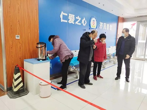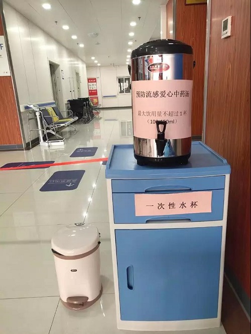 为了避免人员聚集,特意在门诊大厅、急诊大厅各自摆放了一个盛放中药的保温大桶。此中药包含了近十种优质的中药材,由药剂科进行配制、熬煮,然后放入保温大桶供所有人服用!