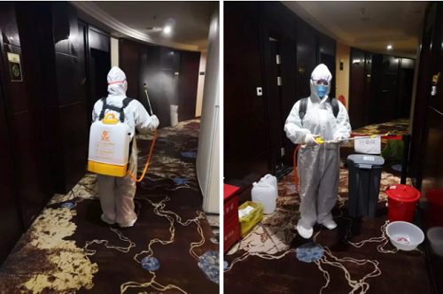 隔离点儿的负责人马书丽背着消毒的器具,正在对隔离点儿的角角落落进行着消毒。深夜里、长长的走廊,一个人的身影略显孤独,脚步却足够坚定,一手拿着消毒器具的手柄认真消毒,一手扶着绑在自己身上的带子让其更牢固。