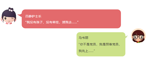 当马书丽被派往驻守隔离点儿一线时,吕静护士长立即向党支部提交了入党申请书,虽然还要经过党的层层考验,才有机会成为预备党员、党员,但是她已经做好了被考验的准备。