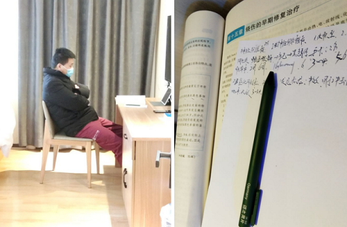 在他还在奋战的时候,帮他的房间进行消毒,发现在他的桌上,敞开着一本打开的书,书上有密密麻麻的笔记,一支笔还依然在那里放着……