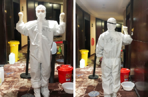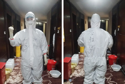 驻守隔离点儿的现场,她身穿防护服全副武装,即使熟悉她的人也很难将其认出,只能通过她背后写的名字来辨认,此刻的她正在聚精会神、一丝不苟的执行着任务。