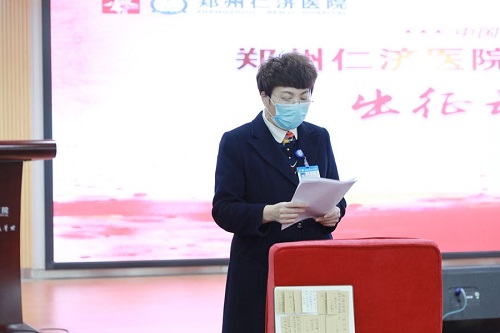 会上,党支部书记郭涛霞进行动员讲话,“同志们,自从2月14日发出倡议以来,大家都在积极备战和准备,今天我们终于正式吹响了出征的号角!此次与我们对接的部门是江岸区抗疫指挥部和卫健委。赴武汉后,我们面对的都是确诊病例,你们的防范意识一定不要放松。医疗队的每一个人代表的都是郑州仁济医院,一定要配合好当地医疗机构的工作,军事化管理,服从组织调遣,做好防护,给疫区带去仁济 优质的医疗服务”。