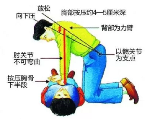 这是一个重建血液循环的方法,也是心肺复苏操作过程里面一个相对比较关键的步骤。采取站立或者跪的姿势在患者身体的一侧,身体正对着患者的两乳头,两膝保持分开状态,尽量与肩同宽。两肩膀要正对着病人的胸骨上方,注意肘关节不能弯曲,两手臂应基本保持伸直的状态。利用上半身的体重以及肩膀和手臂的力量垂直按压患者的胸骨。
